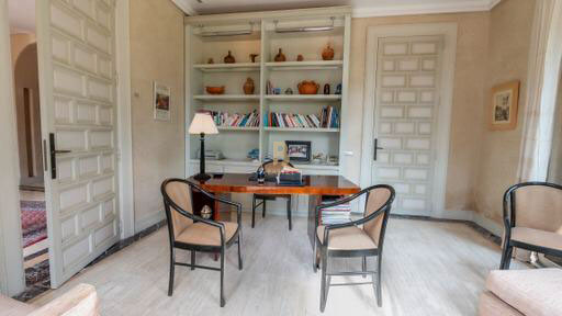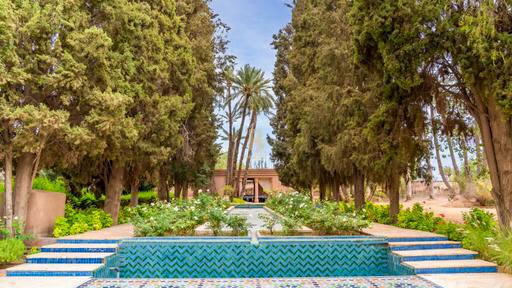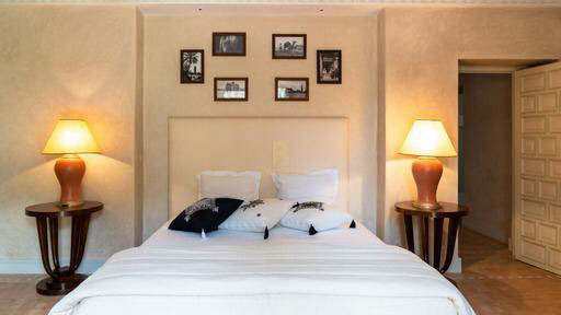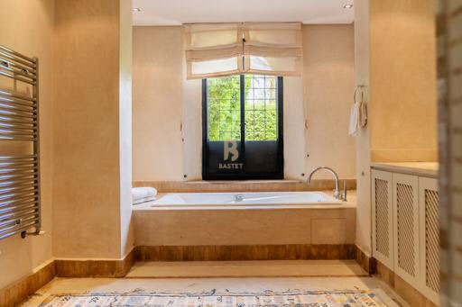 The adjoining pavilion offers four suites with bathroom and two showers, a TV lounge with fireplace and a kitchenette. The exterior features a large swimming pool, a menzeh facing an Andalusian pool, a Jacuzzi in the garden, seating in front of the pool, six sun loungers, and two dining areas on the terraces with parasols. The garden, a veritable oasis surrounded by century-old trees, is home to a farm with orange, lemon and date trees.