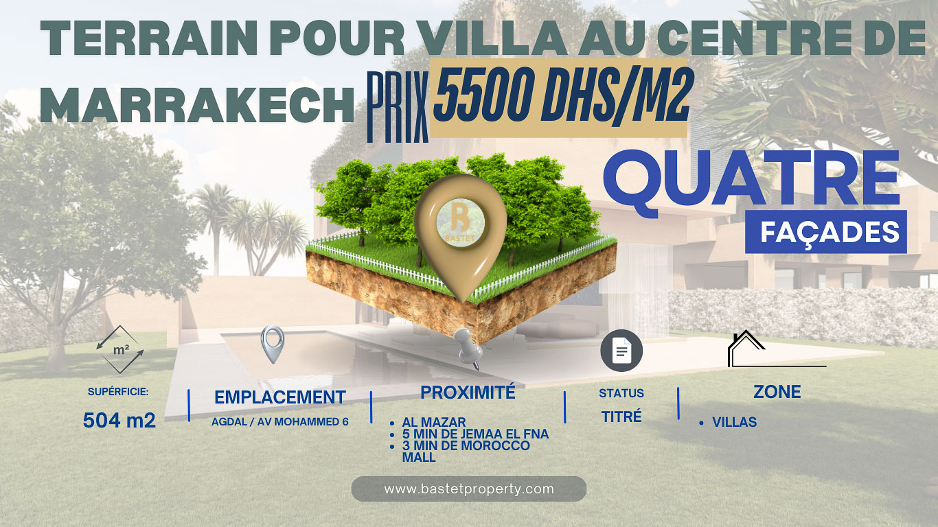 Bastet Property offers for sale this stunning 504 m2 4 façades land plot in a residential area in one of the most demanded area of Marrakech, Agdal, where hotels and luxury villa are set. the land itself is surrounded with 5 & 4 stars hotels, luxury residence villa and apartments, mall center… 5 minutes drive to the city centre